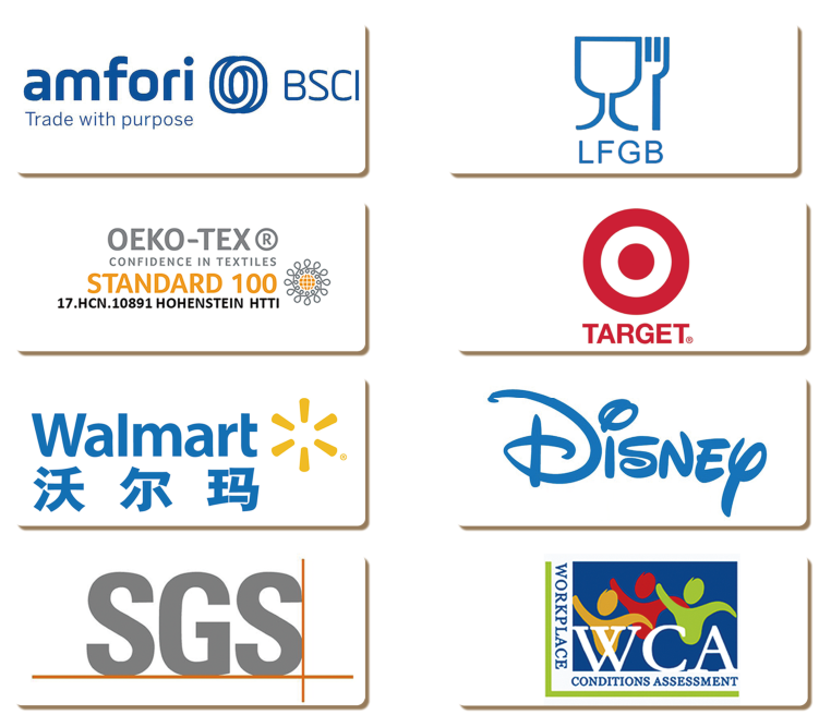 公司視產(chǎn)品質(zhì)量如生命,始終堅持“以創(chuàng)新誠信求生存,以品種質(zhì)量謀發(fā)展”的質(zhì)量方針。公司先后通過ISO9001:2015質(zhì)量管理體系認(rèn)證、ISO14001:2015環(huán)境管理體系認(rèn)證和知識產(chǎn)權(quán)管理認(rèn)證;通過美國沃爾瑪驗廠、迪士尼驗廠、塔吉特驗廠及歐盟BSCI認(rèn)證;產(chǎn)品通過歐洲Oeko-Tex standard 100生態(tài)紡織品1類(嬰幼兒)產(chǎn)品認(rèn)證、WCASQP認(rèn)證;產(chǎn)品通過SGS檢測及BV檢測,未發(fā)現(xiàn)增塑劑、雙酚A、福爾馬林等有害物質(zhì);有害重金屬及有害物質(zhì)符合歐盟EN 71玩具安全標(biāo)準(zhǔn),符合美國ASTM F963玩具標(biāo)準(zhǔn);產(chǎn)品材料符合德國LFGB食品接觸材料管理法、歐盟Reach法規(guī)、ROHS指令的相關(guān)環(huán)保標(biāo)準(zhǔn);抗靜電性能符合歐盟EN 1149抗靜電檢測標(biāo)準(zhǔn)。